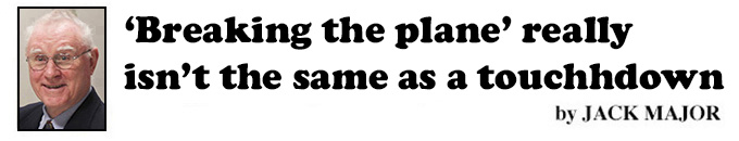Whether the ball actually breaks the plane is often a judgment call, and whether a player deserves to score six points by waving the ball over the goal line, even if he winds up tackled or out of bounds a yard or two short is a matter of debate. Unfortunately, I've yet to hear an announcer or analyst question this questionable rule or rant about the actual difference between a touchdown and a planebreaker.