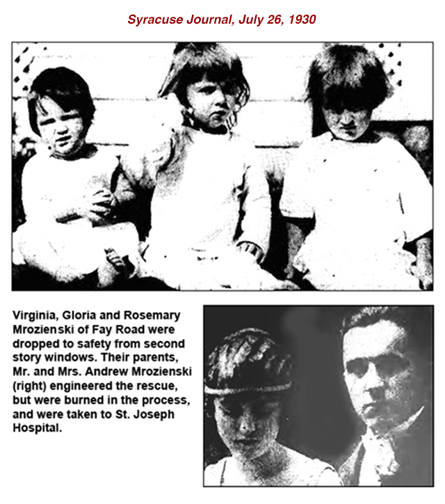 The Mrozienski family had at least two other experiences with fires. According to a 1926 story in the Syracuse American, Andrew Mrozienski was proprietor of the Terminal Hotel on West Fayette Street, Syracuse, when fire broke out there on March 21. The Mrozienskis and all 23 guests were awakened in time to leave the hotel safely. The fire was discovered by one of the guests, who ran to the street and alerted a policeman. Patrolman Edward Flood turned in an alarm and then joined two other policemen in running through the four-story building to alert the occupants. Cause of the fire was a lighted cigarette that a tenant in Room 3 had dropped on the mattress.